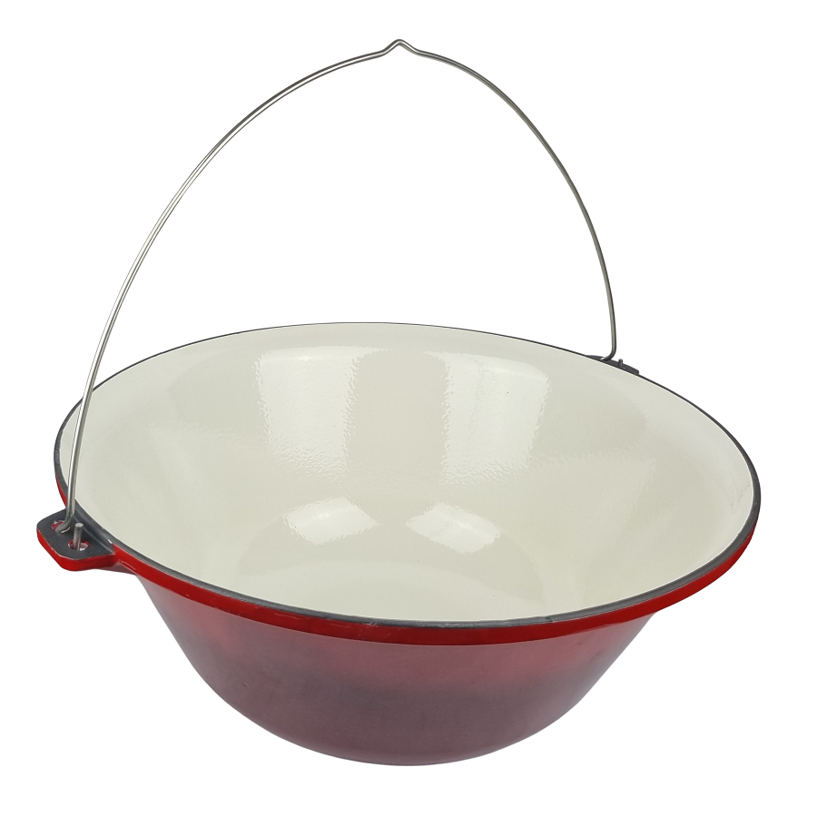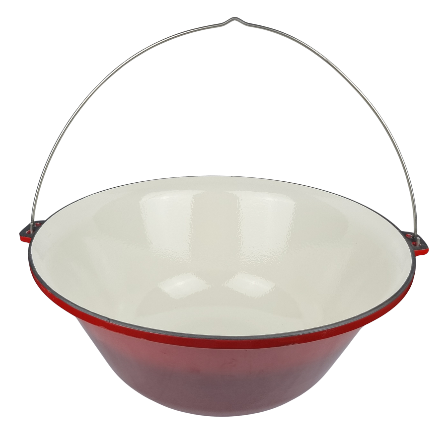 Nagy piros zománcozott öntöttvas bogrács 30 literes, 54 cm átmérő, 24 cm magas.